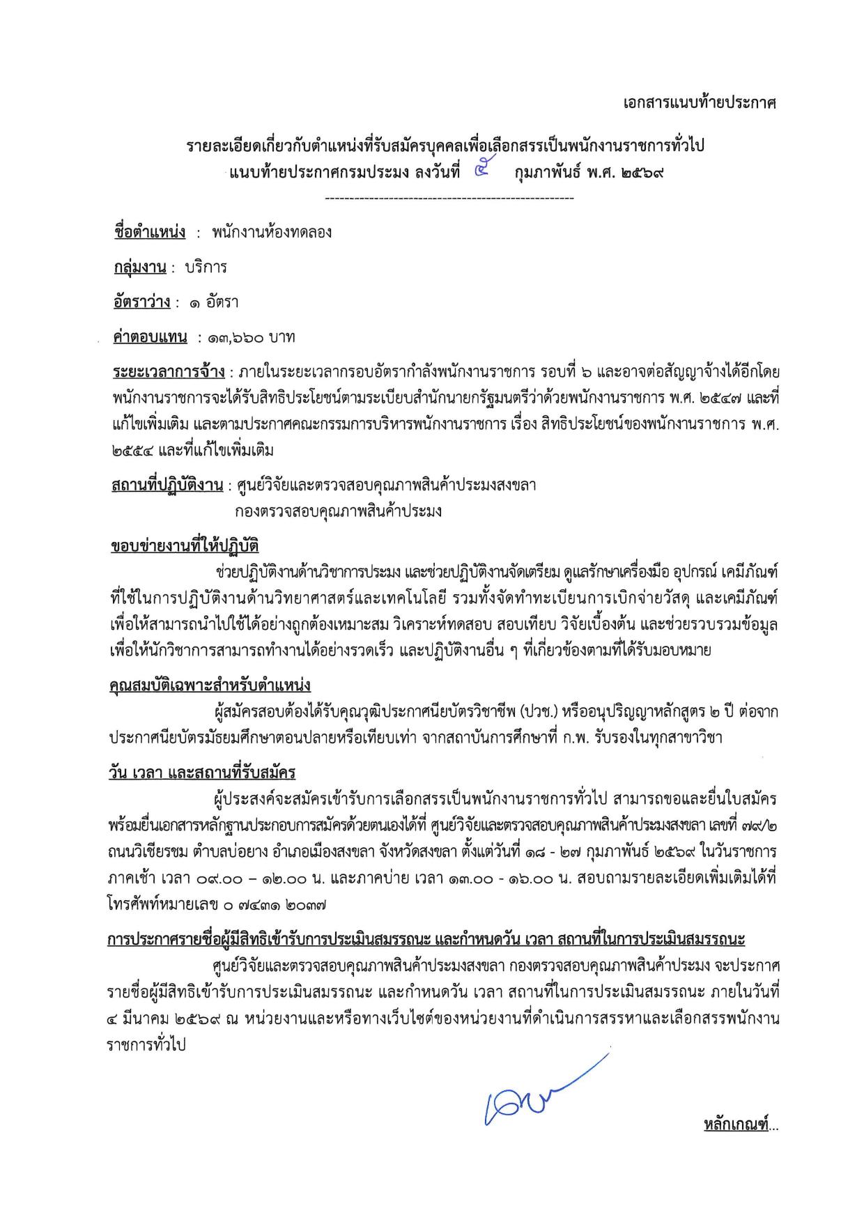พนักงานห้องทดลอง (ศูนย์วิจัยและตรวจสอบคุณภาพสินค้าประมงสงขลา) — 6 หน้า (เหมาะกับมือถือ)